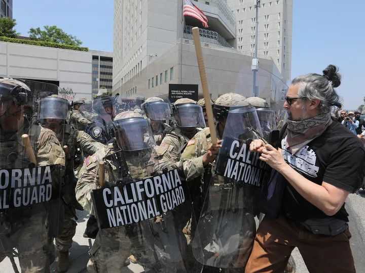 6月8日,洛杉矶市中心的联邦执法机构门前,抗议者与国民警卫队发生冲突。新华社发(邱晨摄)