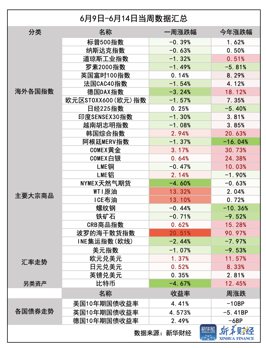 新华财经上海6月15日电本周(6月9日-6月14日),美国通胀数据低于预期,市场对美联储年内降息押注攀升,中东冲突升级,全球资产价格波动加剧,国际油价飙升,黄金价格因避险需求大幅上行,全球主要股指多数下跌。
