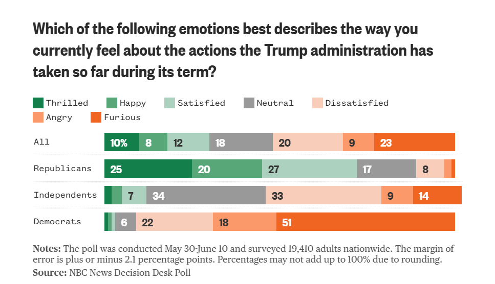 民主党51%表示对特朗普政府“非常愤怒”,独立人士65%不赞成其执政。