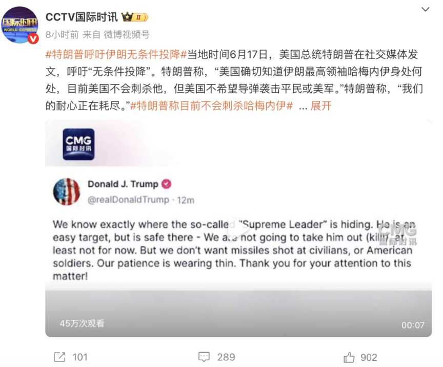 据CCTV国际时讯,当地时间6月17日,美国总统特朗普在社交媒体发文,呼吁“无条件投降”。特朗普称,“美国确切知道伊朗最高领袖哈梅内伊身处何处,目前美国不会刺杀他,但美国不希望导弹袭击平民或美军。”特朗普称,“我们的耐心正在耗尽。”