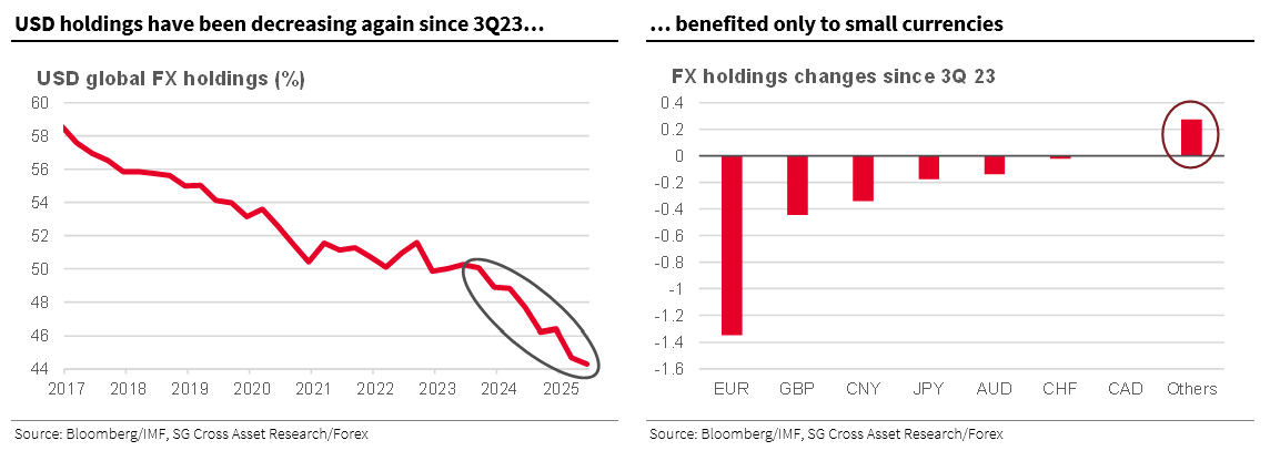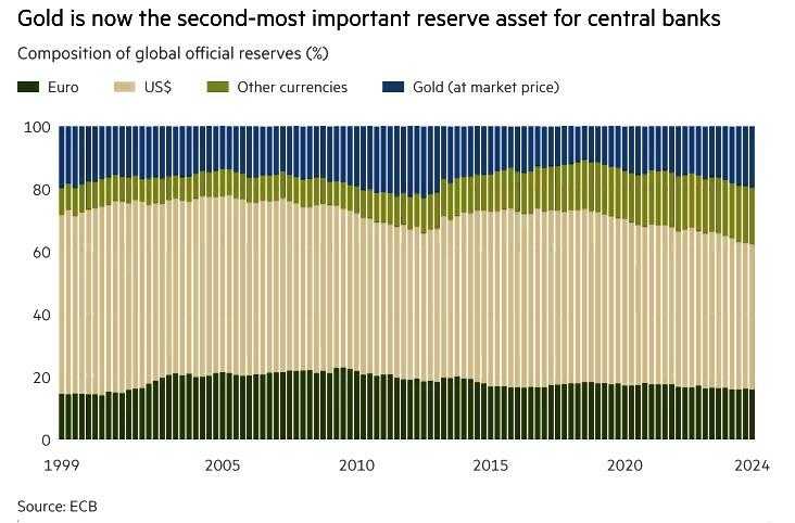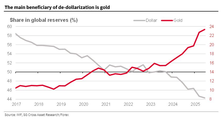 美元的衰落是一个长期过程,始于十多年前,2022年俄乌冲突后加速,当时美元的武器化引发了去美元化。在这一变化背后,最大的赢家似乎是黄金。自2024年以来,去美元化进程并未使其他主要储备货币大为受益,黄金份额反而明显增加。