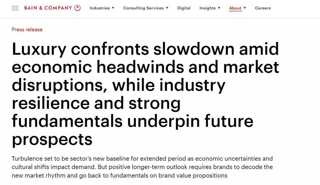 咨询公司贝恩报告显示,全球个人奢侈品销售放缓但前景乐观,销售额2024年达3640亿欧元,预计今年下滑2%至5%,因美国关税威胁和地缘政治紧张局势。奢侈品品牌面临创意危机和涨价问题,各大品牌表现差异大,奢侈品消费者信心与股市走势关联密切。