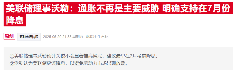 本周三,美联储宣布将联邦基金利率目标区间维持在4.25%至4.50%,这是该行连续第四次决定维持利率不变。发稿前不久,美联储理事沃勒表示,政策制定者应该考虑最早在7月份降低利率。
