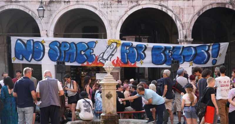 在庆典之外,威尼斯各地悬挂的反对贝索斯横幅,正说明了一部分当地人并不欢迎美国互联网富豪到来。