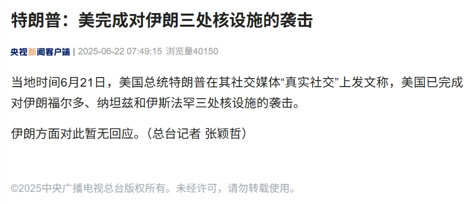 据央视新闻报道,当地时间6月21日,美国总统特朗普在其社交媒体“真实社交”上发文称,美国已完成对伊朗福尔多、纳坦兹和伊斯法罕三处核设施的袭击,但伊朗方面对此暂无回应。