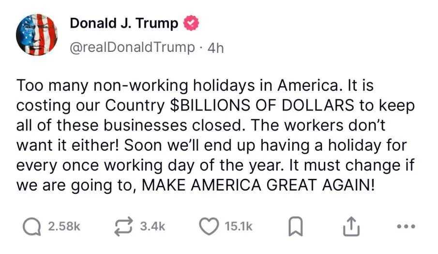 特朗普在社交媒体上批评美国“非工作假期”过多,称企业关门歇业让国家损失数十亿美元。他表示若要让美国再次伟大,必须改变现状。同时,他宣布将设立新节日纪念一战二战胜利,但强调不会因此停业。