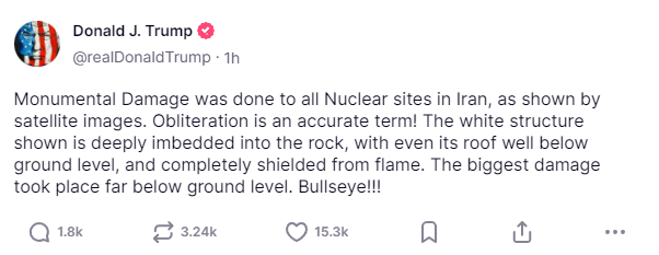 特朗普22日在“真实社交”平台上发文称,“卫星图像显示,伊朗所有核设施都遭受了巨大的破坏。‘彻底摧毁’是一个准确的描述。”他还强调,最严重的破坏发生在地下深处。