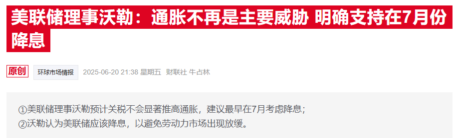 不同的是,沃勒被认为是美联储理事会中最“鸽派”的成员,而鲍曼则是最“鹰派”的官员。因此,当鲍曼承认7月可以谈论降息可能性时,更加能感受到金融市场上的兴奋情绪。