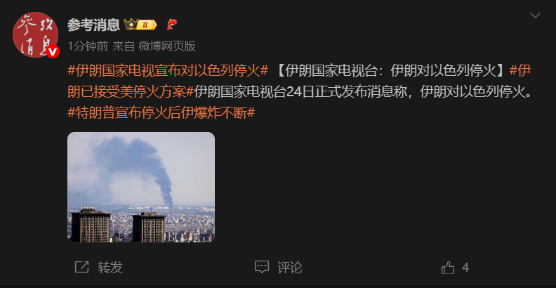 伊朗国家电视台24日正式发布消息称,伊朗对以色列停火。这一消息引发了国际社会的广泛关注,对于地区和平与稳定具有重要意义。