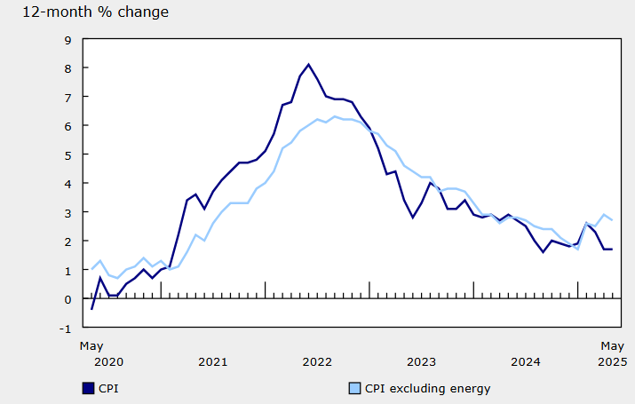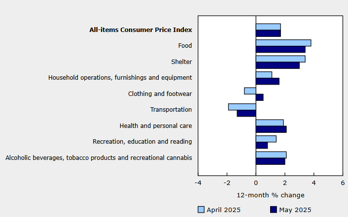 加拿大统计局数据显示,5月CPI同比上涨1.7%,剔除能源后上涨2.7%。租金和旅游价格下跌对CPI构成下行压力,而汽油和移动服务价格降幅收窄则形成上行支撑。