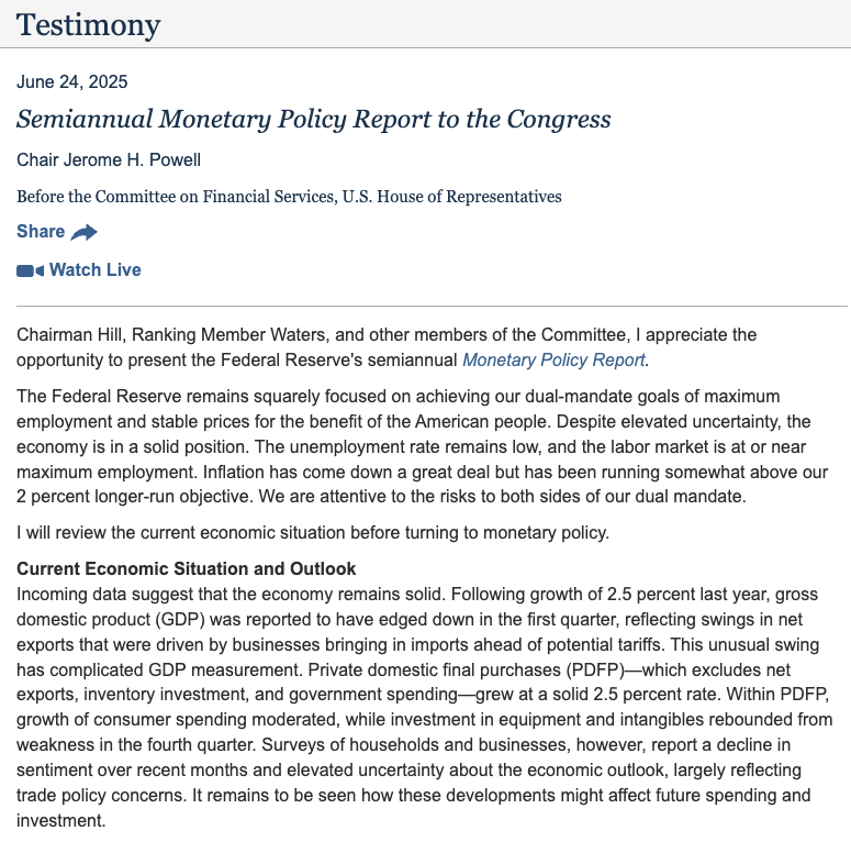 财联社报道,美联储鲍威尔在国会听证会前证词显示,其强调耐心观望更多经济数据走向,暂缓降息立场。美联储内部对降息存在分歧,关键看特朗普关税政策影响。