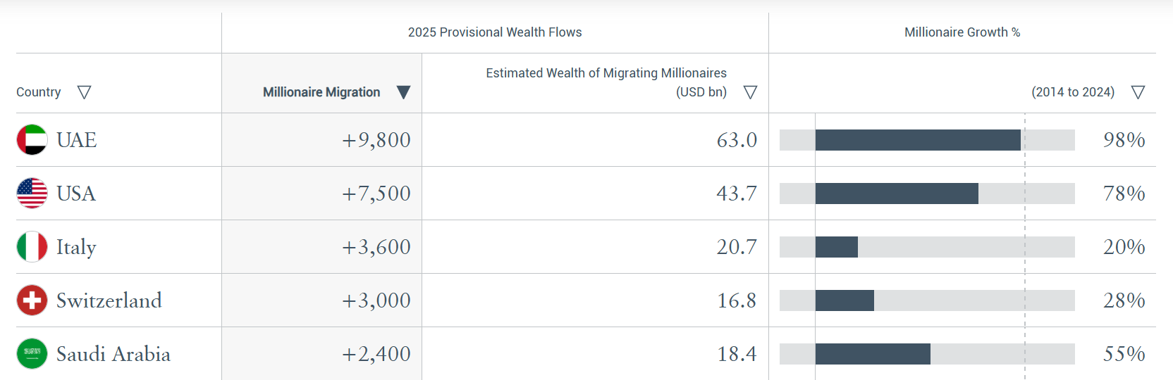 财联社6月25日讯 在全球财富流动格局持续演变的背景下,阿联酋正成为高净值人群重点关注的目的地。国际财经视角下,根据Henley & Partners最新发布的《2025年全球私人财富迁移报告》,今年,阿联酋预计将吸引近万名百万富翁迁入,连续第二年成全球富豪最青睐的迁移目的地。