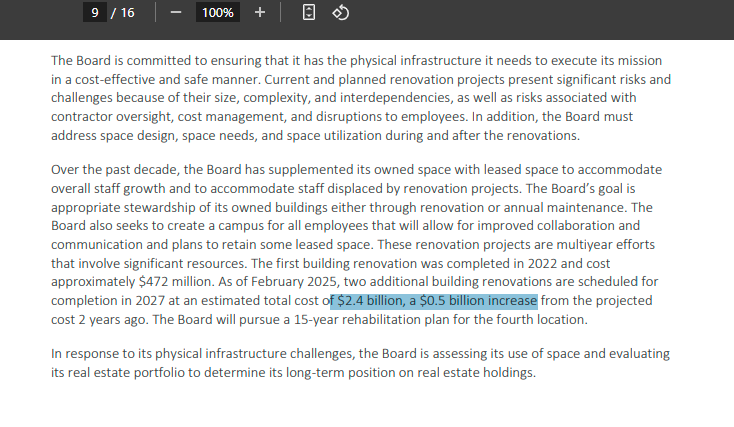 美联储在其网站上的一份声明中已表示,此次翻修“将把大多数董事会工作人员集中到一个园区;减少外部租赁;并为员工提供一个现代化、高效的工作空间,以便他们代表美国人民开展工作。”