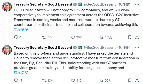 贝森特还表示,将与OECD/G20包容性框架中的其他成员国密切合作,以推动协议落实。“基于这一进展,我已要求参议院和众议院将第899条保护性措施从《大而美法案》审议中移除,”贝森特补充道。美国国会税务委员会主席等随后回应称,将从《大而美法案》中移除拟议的税法第899条款。