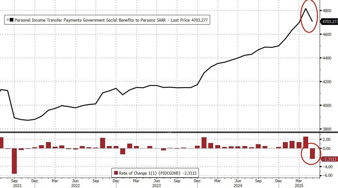 简而言之,5月PCE报告可以归纳为收入和支出都在萎缩,只有通胀在上升,这给美国经济前景蒙上阴影。不过数据也显示,个人收入数据的下降主要由于美国联邦政府的转移支付减少,“政府效率部”等机构的行动似乎引发了社会福利金发放的骤然下降。