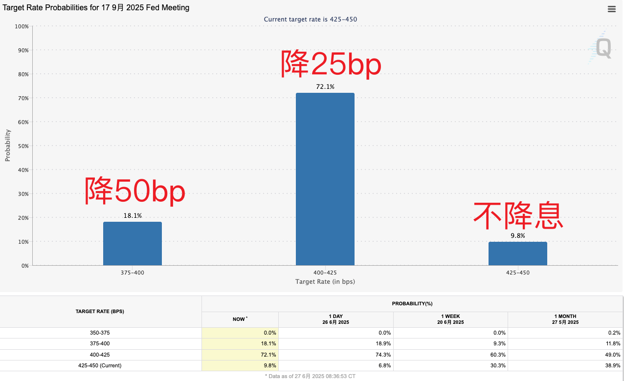 (9月会议节点降息概率预期,来源:CME)