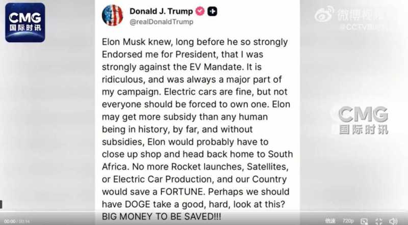 特朗普在帖文中称,“埃隆·马斯克在强力支持我竞选总统之前,早就知道我强烈反对‘电动汽车强制令’。这太荒谬了,这一直是我竞选活动的主要部分。电动汽车没问题,但不应该强迫每个人都拥有一辆。埃隆获得的补贴可能远远超过历史上任何一个人。如果没有补贴,埃隆可能不得不关门大吉,回到南非老家。不再有火箭发射、卫星或电动汽车生产,我们的国家将节省一大笔钱。也许我们应该让政府效率部好好查查?这能省下一大笔钱!”