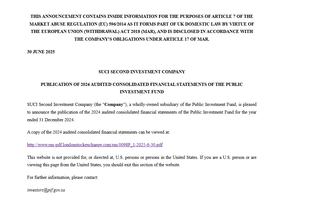 本周一,沙特主权财富基金——公共投资基金(PIF)在伦敦证券交易所发布了截至2024年底的合并财务报表。