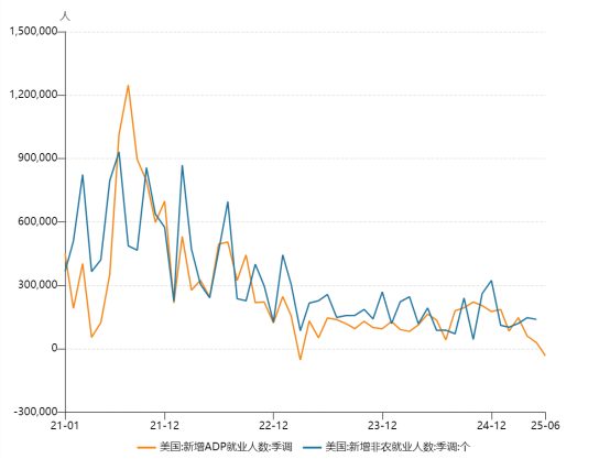 ADP就业数据由ADP研究所与斯坦福数字经济实验室合作发布,主要关注美国私营部门的就业情况。6月数据显示,私营部门就业人数减少3.3万人,为2023年3月以来最大降幅,而预估为增加9.8万人。28位经济学家的预测区间从增加2万人到增加13万人不等。