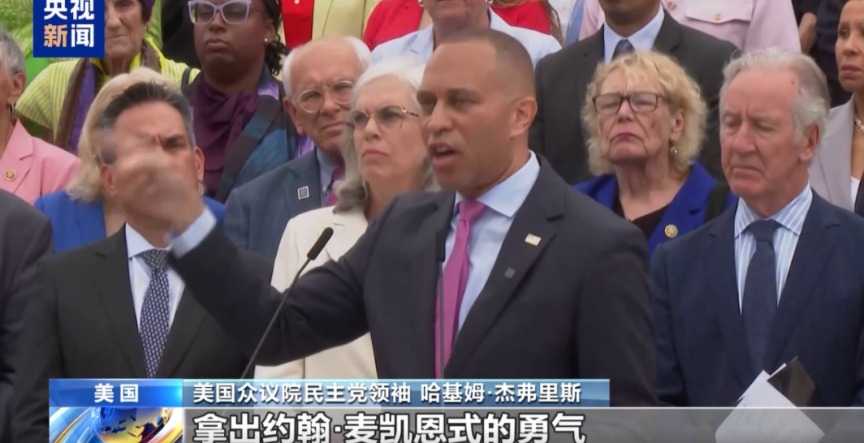 7月2日上午,在美国国会众议院开会讨论参议院版本的所谓“大而美”法案之前,美国国会众议院民主党议员们聚集在国会大厦台阶前召开新闻发布会并表示,民主党在众议院的所有成员将一致投票反对所谓“大而美”法案。众议院民主党领袖哈基姆·杰弗里斯表示,只需要四名共和党人转变态度投票反对,该法案就可能被否决。他呼吁共和党人展现出勇气。