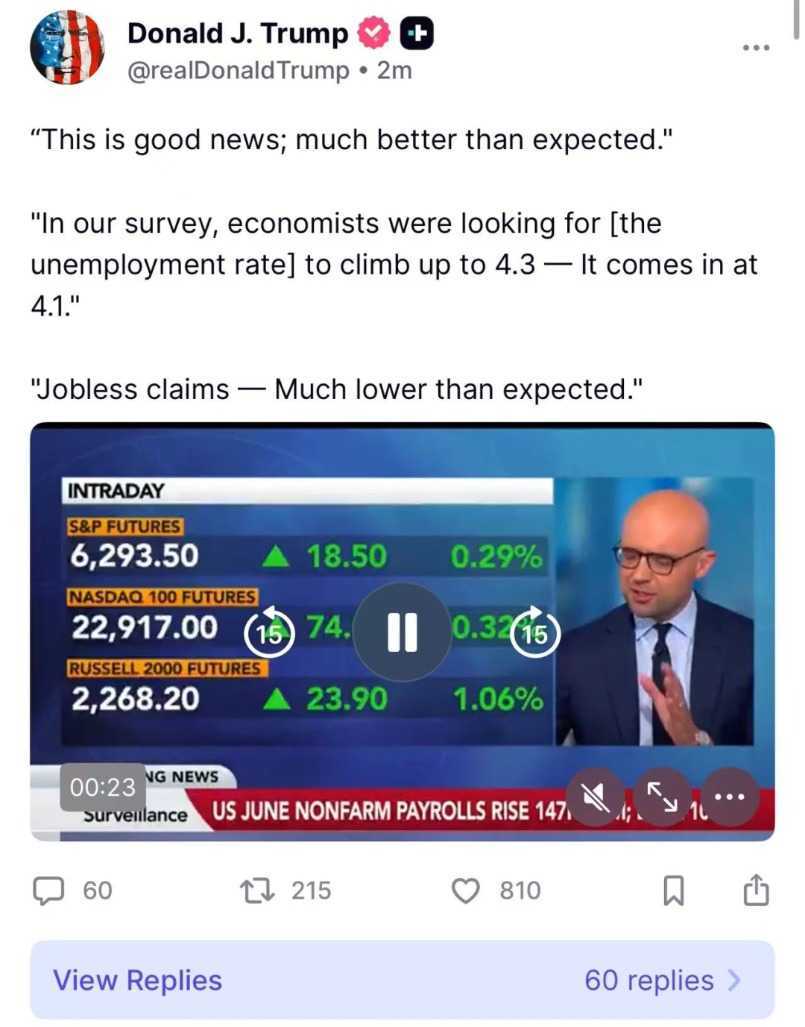 美国总统特朗普发文称,“今天的数据是个好消息,比预期的要好得多。在我们的调查中,经济学家预计失业率将攀升至4.3%,而实际失业率为4.1%。申请失业救济的人数远低于预期。”