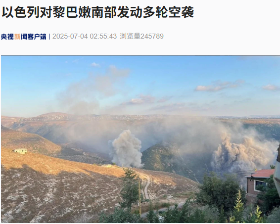 据央视新闻7月4日消息,总台记者从黎巴嫩方面获悉,当地时间7月3日下午,以色列对黎巴嫩南部多个地区发起多轮空袭。遭到袭击的地点包括黎南部的杰津区、纳巴提耶区等地以及利塔尼河附近的多个地区。