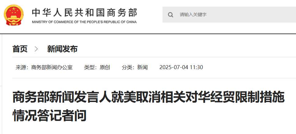 7月4日,商务部就美取消对华经贸限制措施答记者问,称中美伦敦经贸会谈后双方确认落实共识细节,美方取消限制性措施,中方正审批出口许可申请,希望美方继续相向而行。
