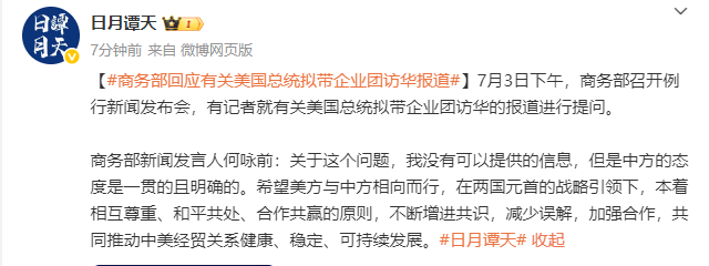 此外,7月3日下午,商务部召开例行新闻发布会。有记者就有关美国总统拟带企业团访华的报道进行提问。商务部新闻发言人何咏前表示,关于这个问题,我没有可以提供的信息,但是中方的态度是一贯的且明确的。希望美方与中方相向而行,在两国元首的战略引领下,本着相互尊重、和平共处、合作共赢的原则,不断增进共识,减少误解,加强合作,共同推动中美经贸关系健康、稳定、可持续发展。