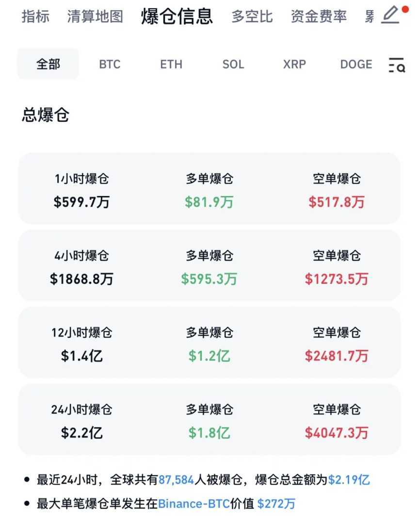 据Coinglass统计,过去近24小时内,加密货币全网爆仓人数近9万人,爆仓金额为2.19亿美元。其中,最大单笔爆仓单发生在Binance-BTC,价值272万美元。