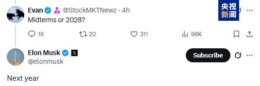 在这条宣布成立的帖文下,有网友问他的新政党是否会参加2026年中期选举或2028年的总统选举时,马斯克回复称,“明年”。