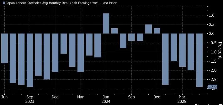 日本5月实际工资连续第5个月减少,跌幅为2023年9月以来最大,名义工资增加但高物价抵消。春斗谈判结果或夏季反映,首相石破茂面临通胀与关税威胁,内阁支持率连续4个月低于30%。