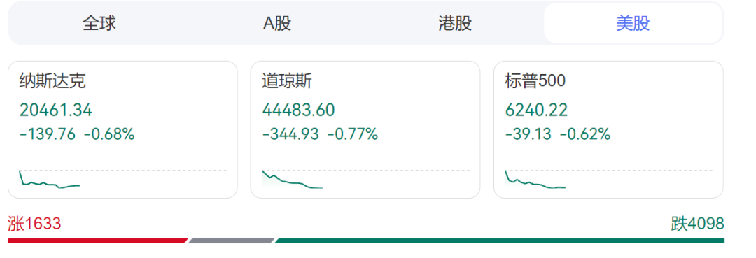 7月7日晚间,美股三大指数开盘后集体走低。截至发稿,道指、纳指、标普500跌幅分别为0.77%、0.68%、0.62%。