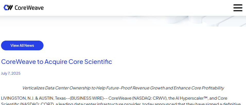 周一(7月7日),CoreWeave在官网宣布,已签署最终协议,将以全股票交易的方式收购Core Scientific:每股Core Scientific普通股可换取0.1235股新发行的CoreWeave A类普通股。