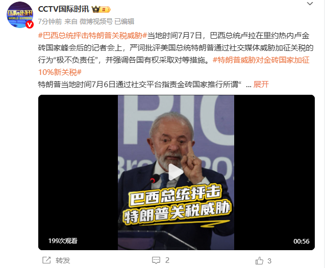 巴西总统卢拉批评特朗普通过社交媒体威胁加征关税的行为,特朗普指责金砖国家推行“反美政策”并威胁加征新关税,中国外交部发言人表示贸易战、关税战没有赢家。