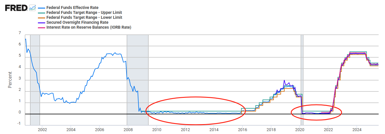 研究提到的“零利率下限”(ZLB)指的是联邦基金利率区间下限位于0%的形态:2008年金融危机爆发后,美联储维持在该区间——0%-0.25%七年之久。