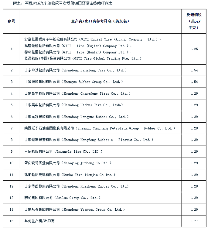 巴西外贸委员会决定继续对原产于中国的汽车轮胎征收反倾销税,有效期5年,税率为1.25-1.77美元/千克,涉案产品为特定尺寸和规格的轮胎。