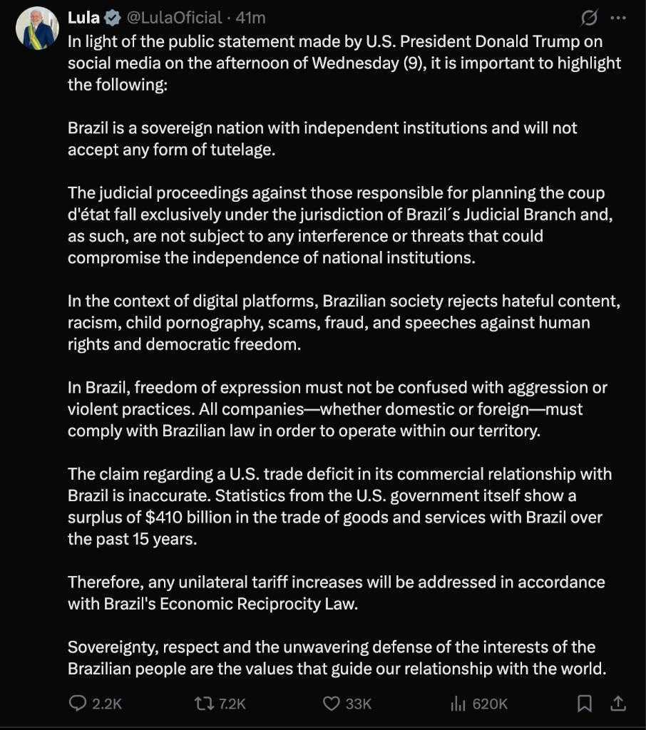 卢拉的这一回应,是对美国总统特朗普当天早些时候威胁向巴西加征关税的直接回应。特朗普在社交媒体平台“真实社交”上发布致卢拉的信函,宣布将自8月1日起对从巴西进口的商品征收50%的关税,此举无疑加剧了两国之间的贸易紧张关系。