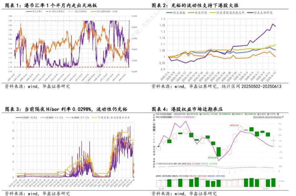 这场汇率"天地板"行情背后,是香港金管局罕见的双向操作:5月初为应对港币强势,三日内向市场注入1294亿港元流动性;6月末又因汇率走弱,两周内回笼590亿港元。对此华鑫证券在其研报中指出,汇率波动原因、联系汇率制度,并展望港股下一步走向。