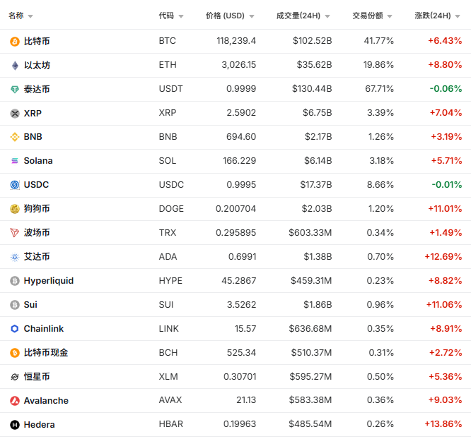 7月11日午后,比特币大幅拉升,突破11.8万美元关口,24小时内涨幅超过6%。以太坊、艾达币、狗狗币等均有不同程度上涨。