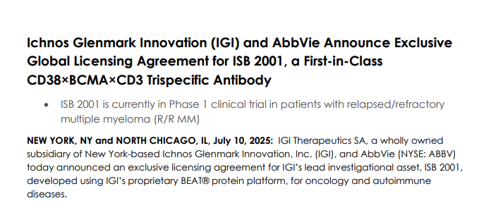 作为背景,美国生物制药公司艾伯维与印度格伦马克制药的子公司周四晚些时候宣布,就一款肿瘤和自身免疫疾病药物ISB 2001达成独家授权协议。