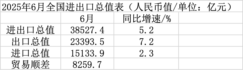 以人民币计,6月中国进出口总值3.85万亿元,同比增长5.2%;出口总值2.34万亿元,同比增长7.2%;进口总值1.51万亿元,同比增长2.3%;贸易顺差8259.7亿元。