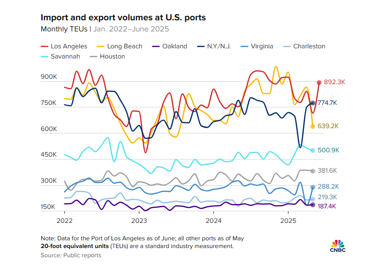 官方数据显示,洛杉矶港当月共处理了892,340个20英尺标准箱(TEU),远高于去年同期,增长约8%。6月份创纪录的进口量也较5月份增长了32%。自4月份特朗普政府对全球几乎所有国家征收基准关税以来,该港进口放缓。