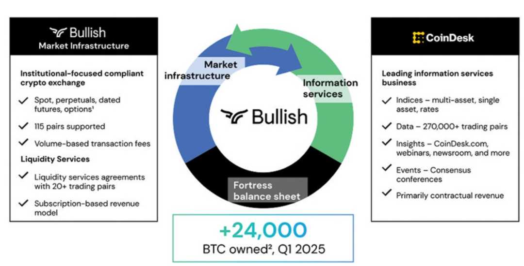 经过多年经营,Bullish的业务版图扩大。根据招股书,Bullish的业务主要分为两大块:加密货币交易所Bullish,以及2023年收购的数据和媒体业务Coindesk。另外,公司还持有超过2.4万个比特币。