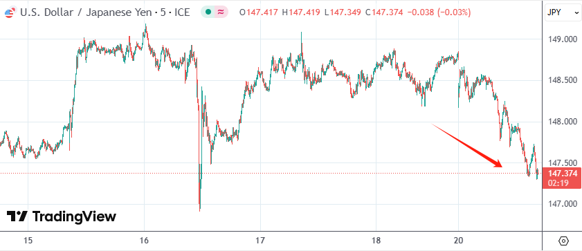 具体行情显示,美元兑日元日内一度跌逾150点至147.34。截至发稿,跌幅收窄至0.95%附近——日元汇率仍有望录得近一个月来的最大单日涨幅。