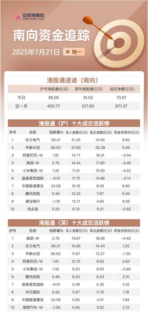 据Wind数据显示,南向资金周一净流入约70.51亿港元,其中沪港股通净流入约39.00亿港元,深港股通净流入约31.52亿港元。