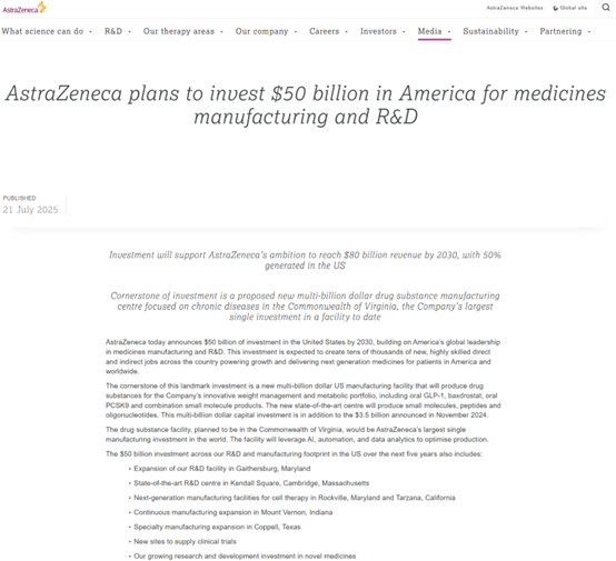 阿斯利康表示,宣布这一消息的时间和地点与美国的政策环境有关。声明还称,新的投资承诺是其2024年11月宣布的35亿美元投资的补充。