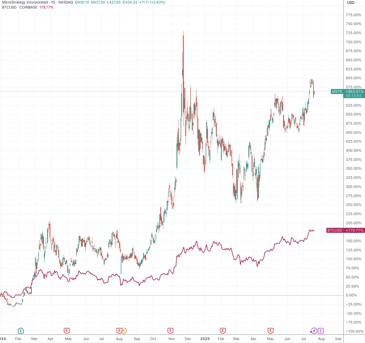 (MicroStrategy股价弹性显著高于比特币,来源:TradingView)