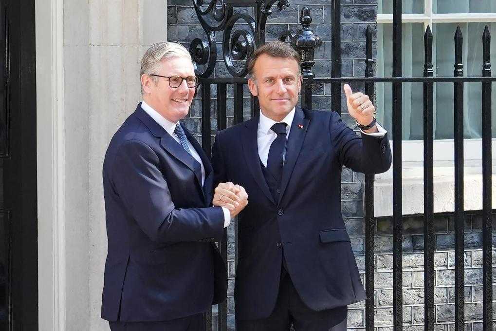 7月10日,英国首相斯塔默与法国总统马克龙握手。新华社记者吴鲁摄