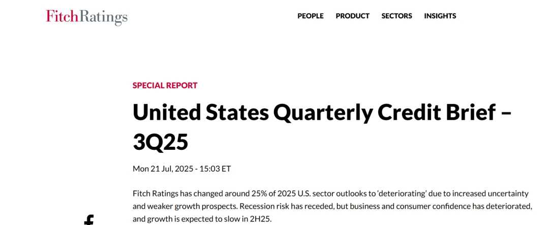 惠誉评级在年中更新报告中下调美国约四分之一行业前景展望至恶化,指出美国经济不确定性上升,增长放缓风险加剧,同时政府赤字和债务问题严重。