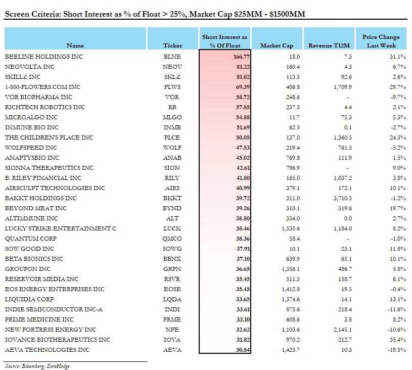 有业内人士对微型和小型公司进行了筛选,这些公司空头头寸占自由流通股比例均超过了25%。